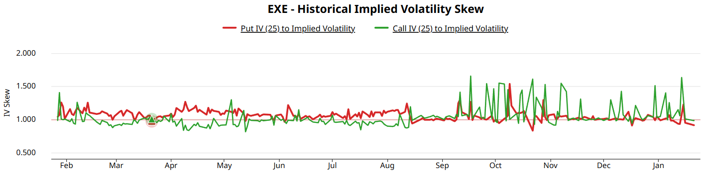 What we do know is that, on a relative basis, since downside protection commands a premium, upside calls are cheap. If we have good reason to believe that EXE stock could swing higher on a given expiration date, the calls could be mispriced in our favor.