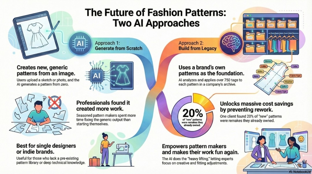 What makes fashionINSTA different starts with who built it. Sylwia Szymczyk spent 15 years on factory floors and in pattern rooms before writing a single line of code. She knows what technical developers need because she was one. The platform extracts 750+ features from each pattern (armholes, ease, curves, construction methods) and trains custom AI models on each brand's existing pattern library, preserving the fit DNA and construction logic that took years to develop.