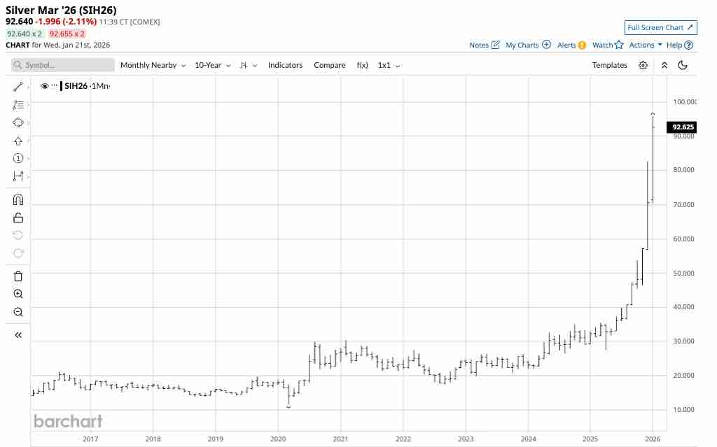 Silver’s parabolic rally has continued into 2026, with the price reaching over $95 per ounce on the nearby March COMEX silver futures contract.