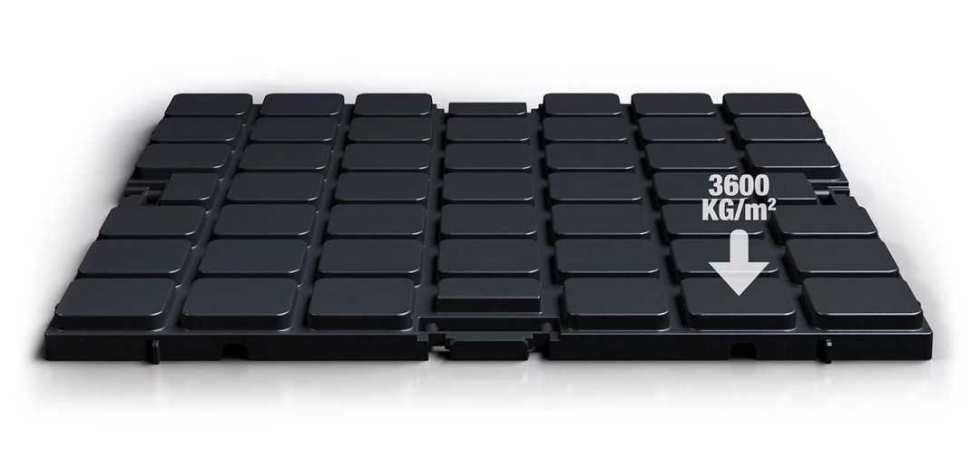 Despite its lightweight, plastic composition, the Stand-ON floor boasts a load-bearing capacity of 3,600 kg per square meter. This capability allows the flooring to be used in heavy-duty environments, including automotive showrooms where vehicles are parked directly on the raised tiles. The jury was impressed that a system so easy to install (requiring no tools) could support such immense weight.