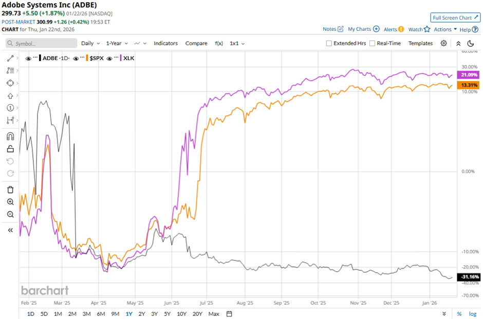 Shares of Adobe have decreased 31.5% over the past 52 weeks, lagging behind the broader S&P 500 Index's ($SPX) 13.6% rise and the State Street Technology Select Sector SPDR ETF's (XLK) 20% return over the same period.