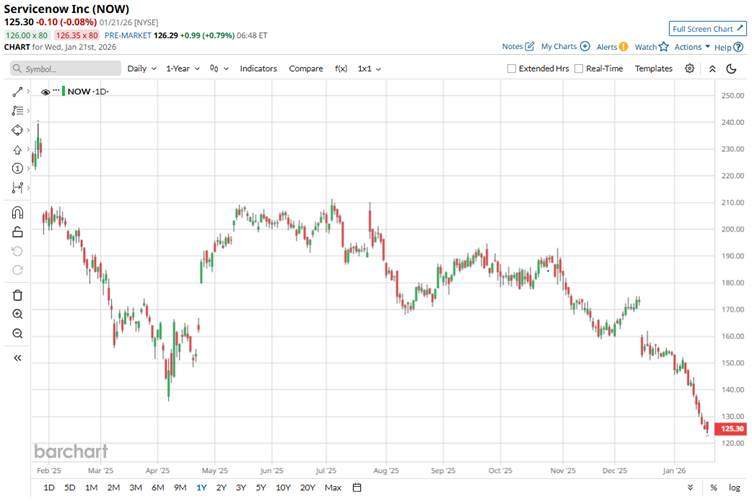 ServiceNow’s stock performance in recent periods has been marked by notable volatility and a sharp pullback. After a period of strong gains through much of 2024, where the shares climbed significantly alongside broad enthusiasm for enterprise software and AI-driven growth, NOW began to slide through 2025 and into 2026, pressured by sector-wide headwinds and shifting investor sentiment around software valuations.