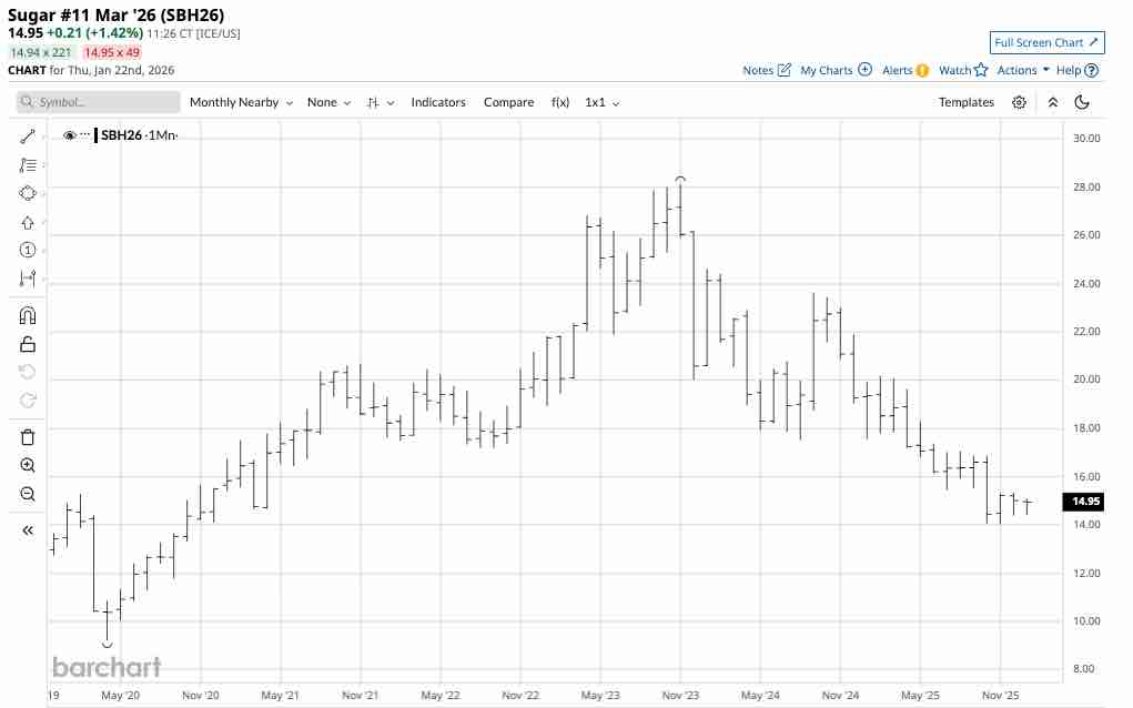 The monthly continuous ICE world sugar futures contract chart shows that the sweet commodity moved 50.11% lower from the November 2023 high of 28.14 cents to the November 2025 low of 14.04 cents per pound. While sugar futures have remained above 14 cents per pound, the price was just below 15 cents per pound in late January 2026.
