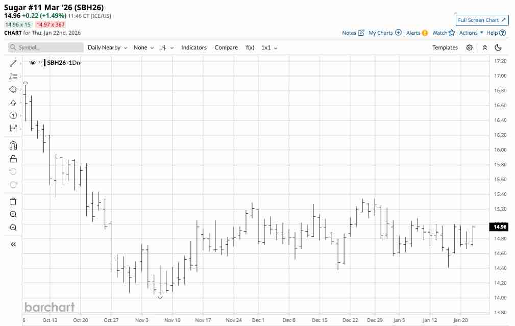 The chart shows that the daily continuous sugar #11 futures contract has traded between 14.35 and 15.34 cents per pound since November 14, 2025. At 14.96 cents on January 21, the sugar futures were in the middle of the narrow trading range.