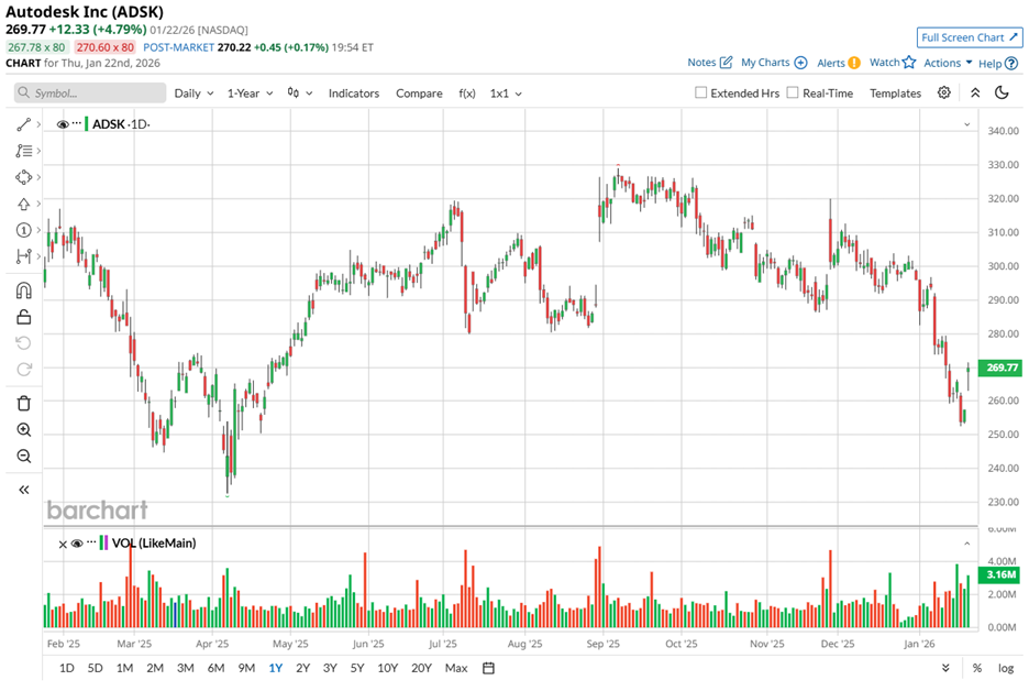 Yet market performance has lagged operational strength. Over the past 52 weeks, ADSK stock declined 11%. Selling pressure intensified recently, with the stock down 14% over the past three months and another 10% in just the last month.