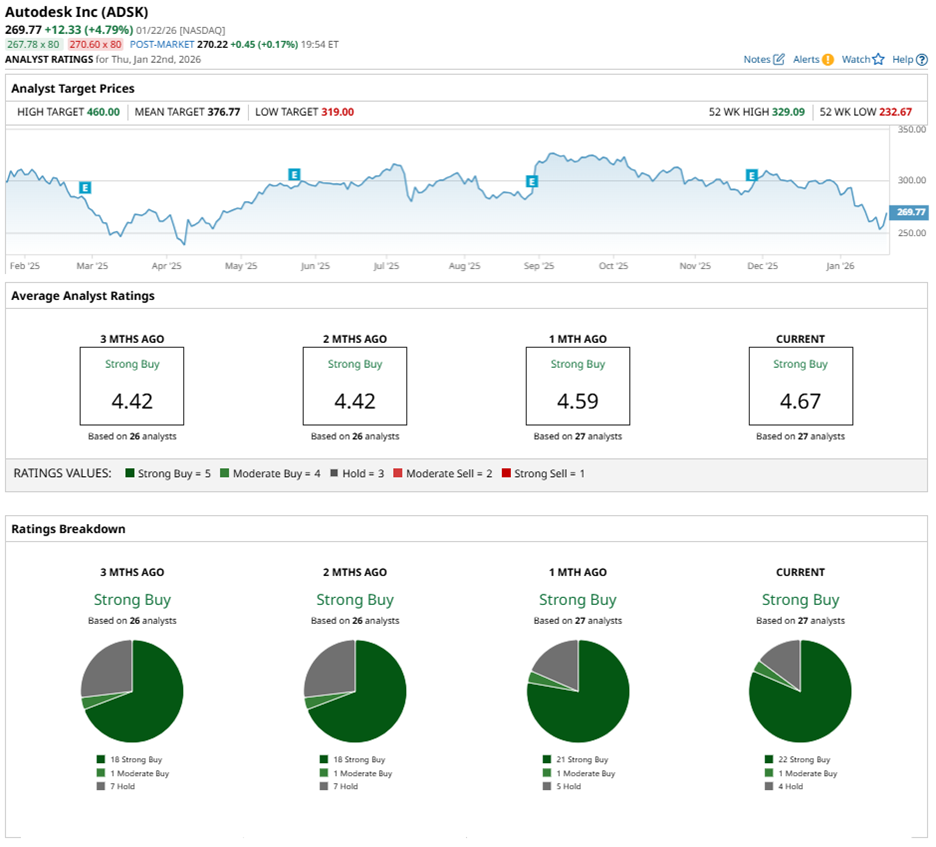 Wall Street continues to back Autodesk’s outlook with conviction. ADSK stock carries a “Strong Buy” consensus rating, supported by 22 of 27 analysts issuing “Strong Buy” ratings. One analyst recommends a “Moderate Buy,” while four advise “Hold.”