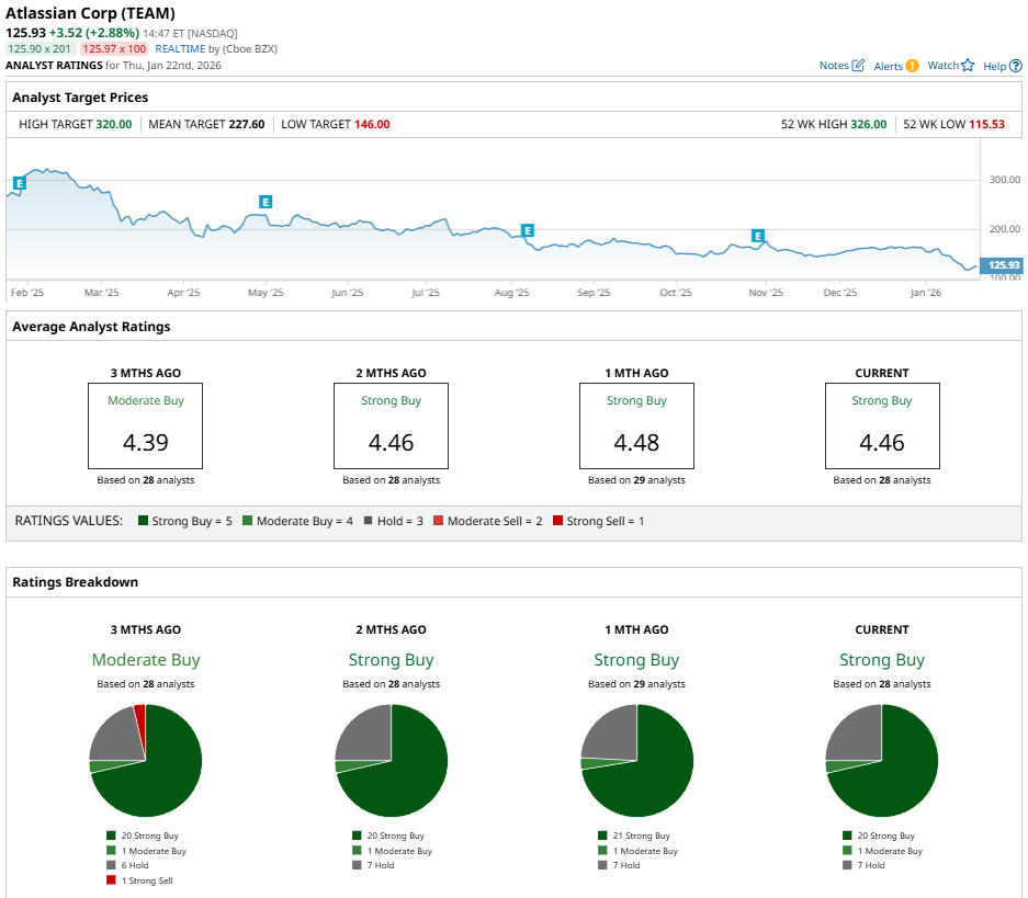 Despite the heavy losses Atlassian investors have suffered of late, analysts generally remain firm on TEAM with a consensus “Strong Buy” rating. The mean price target sits at $226.80, reflecting potential upside of 73% from the current market rate. Based on 28 market experts with coverage, TEAM has 20 “Strong Buy” ratings, one “Moderate Buy” rating, and seven “Hold” ratings.