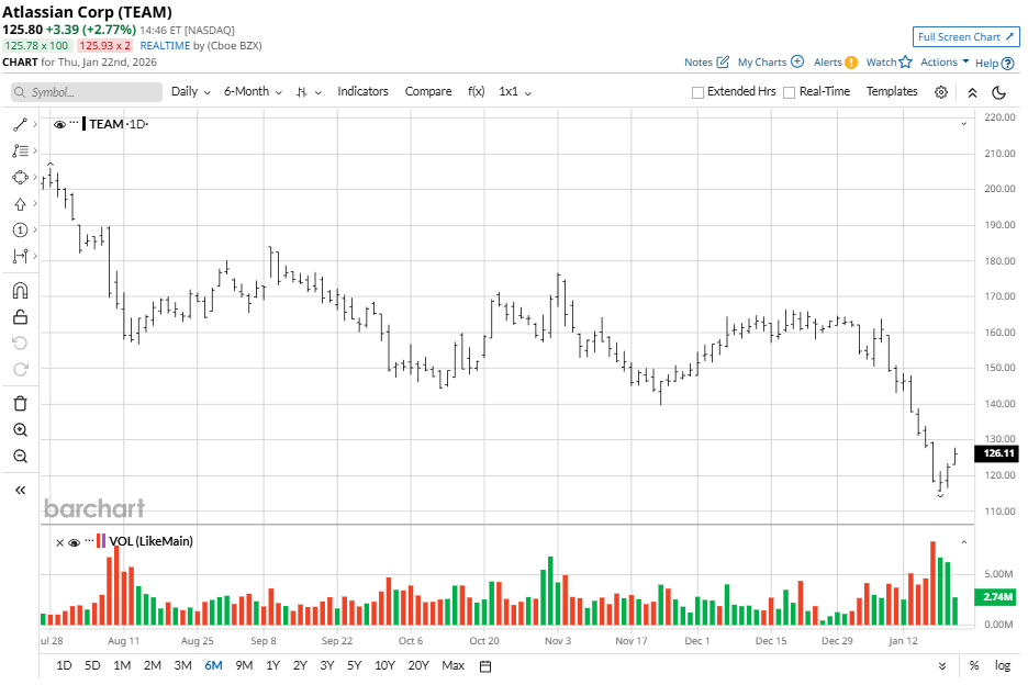 TEAM stock is down 60% from its 52-week high of $326 and trades for about $131 per share, near its 52-week low of $115.53 set earlier this month. The stock has declined 19% over the past month and 35% over the past six months.