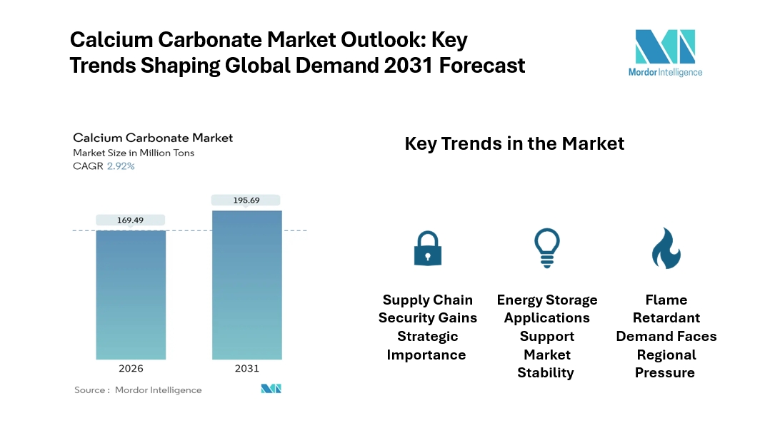 According to Mordor Intelligence, the calcium carbonate market is rising from 169.49 million tons in 2026 & is projected to reach 195.69 million tons by 2031, registering a CAGR of 2.92%.