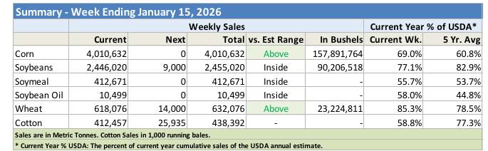 Consolidation and a choppy trade were the key features in corn this week until the market received this week’s export sales report for corn in my opinion. Buyers remained mostly idle amid a flurry of fundamental and technical challenges, stemming from the January 12th crop report. Managed funds in my view have pushed out to a sizable short from neutral post report in the last two weeks. Ending stocks swelled on increased acres as yield and production were record large. In another black eye for corn, legislation to allow year-round sales of higher ethanol blends in the U.S. was left out of a suite of 2026 spending bills, as lawmakers sought to avoid another government shutdown. Futures reacted minimally, though producers and the National Corn Growers Association were quick to show disapproval. USDA’s Prospective Plantings Report at the end of March could be the next major market mover, unless weather in South America shows lower corn production potential in Argentina, amid corn planting just getting underway in Brazil. There is increased talk by some crop scouts that current Argentine production estimates are tedious given that Argentine soybean crop ratings have declined for two consecutive weeks, dropping 30 points in the good to excellent category. Extended forecasts showing weather conditions are not improving into February while reports Argentina’s corn crop has seen production loss as well as good to excellent ratings have dropped 23 percentage points in the last two weeks.