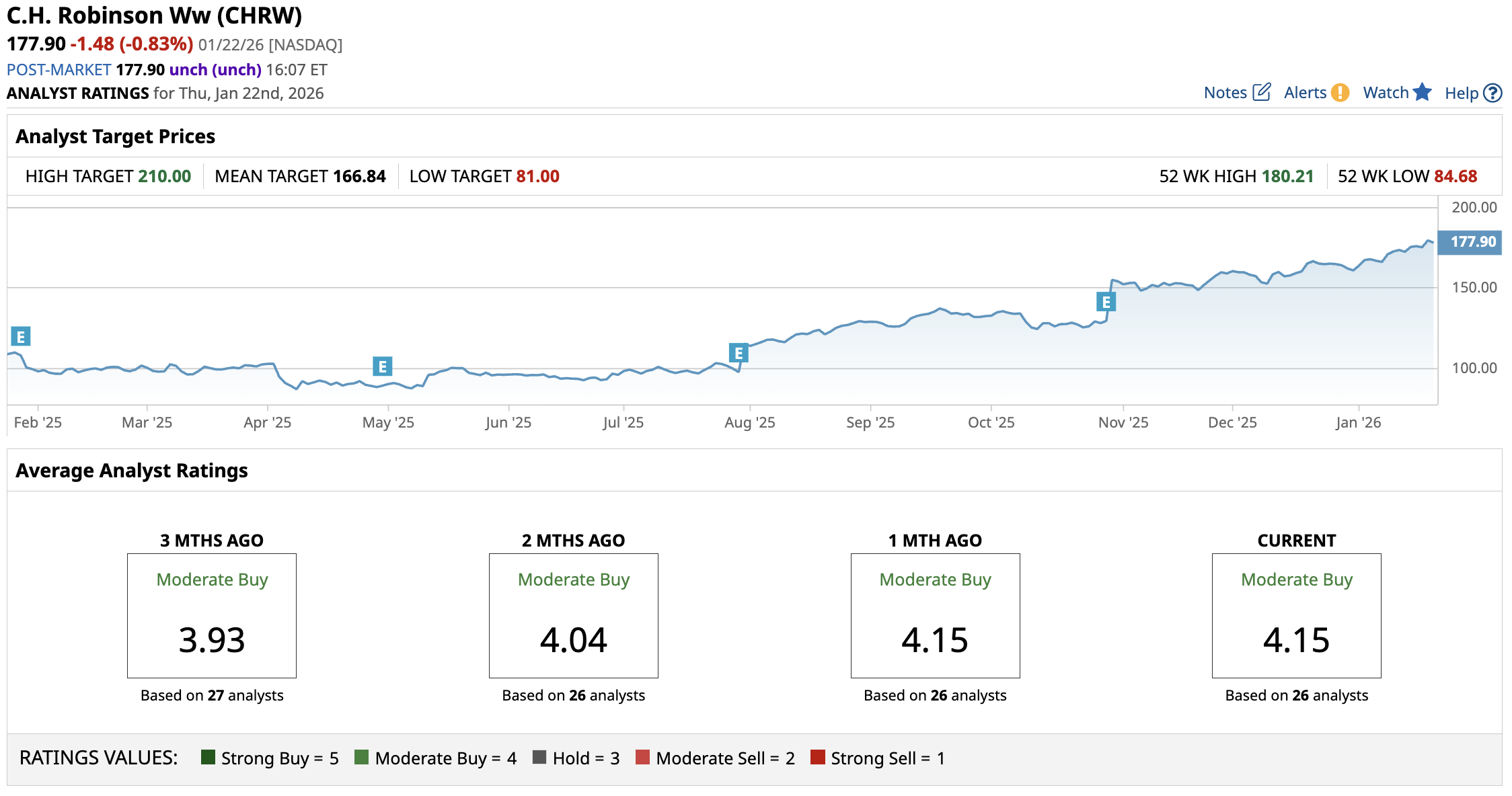 In its most recent financials, the company’s sales decreased 11% YOY to $4.1 billion, while net income rose 68% to $163 million. C.H. Robinson Ww pays a forward annual dividend of $2.52, translating to a yield of approximately 1.4%.