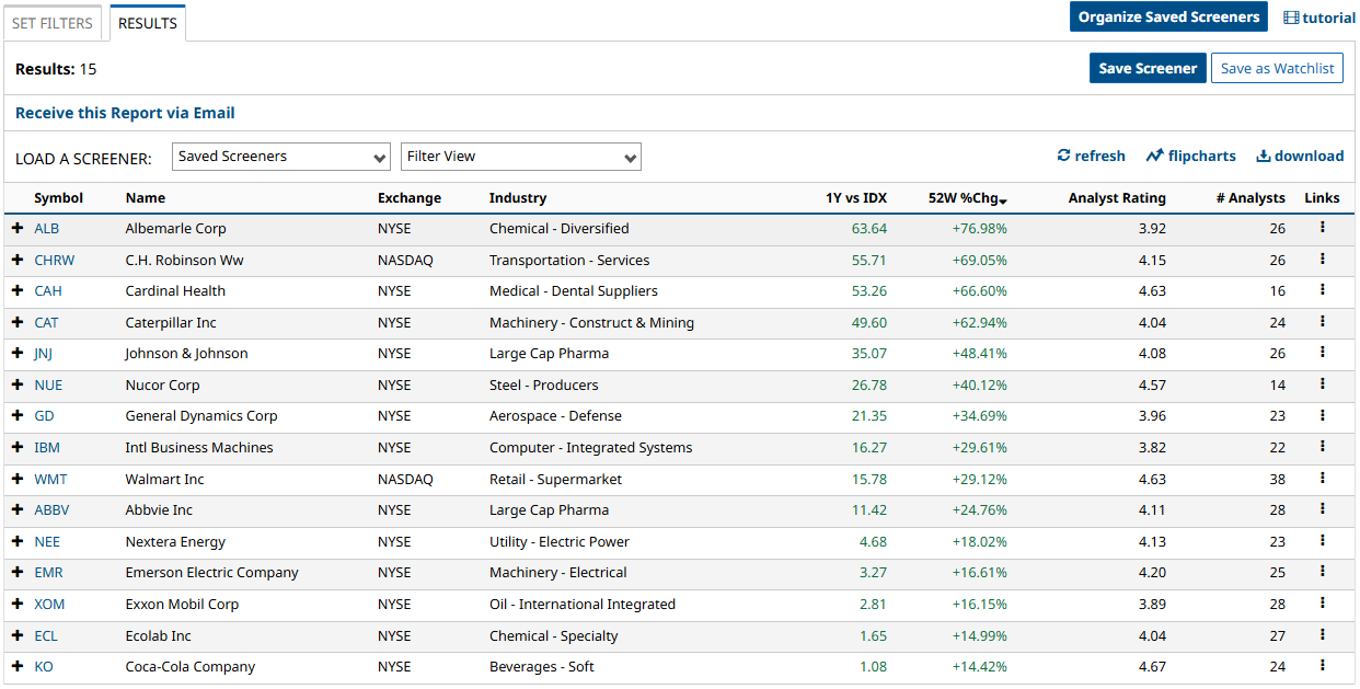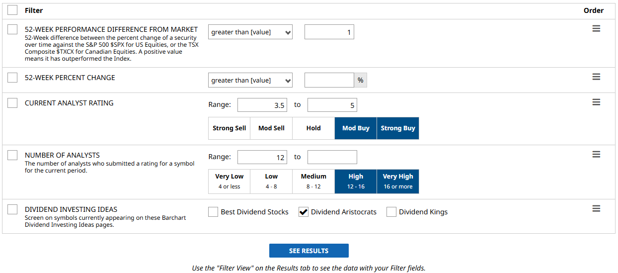 Using Barchart’s Stock Screener, I selected the following filters to get my list: