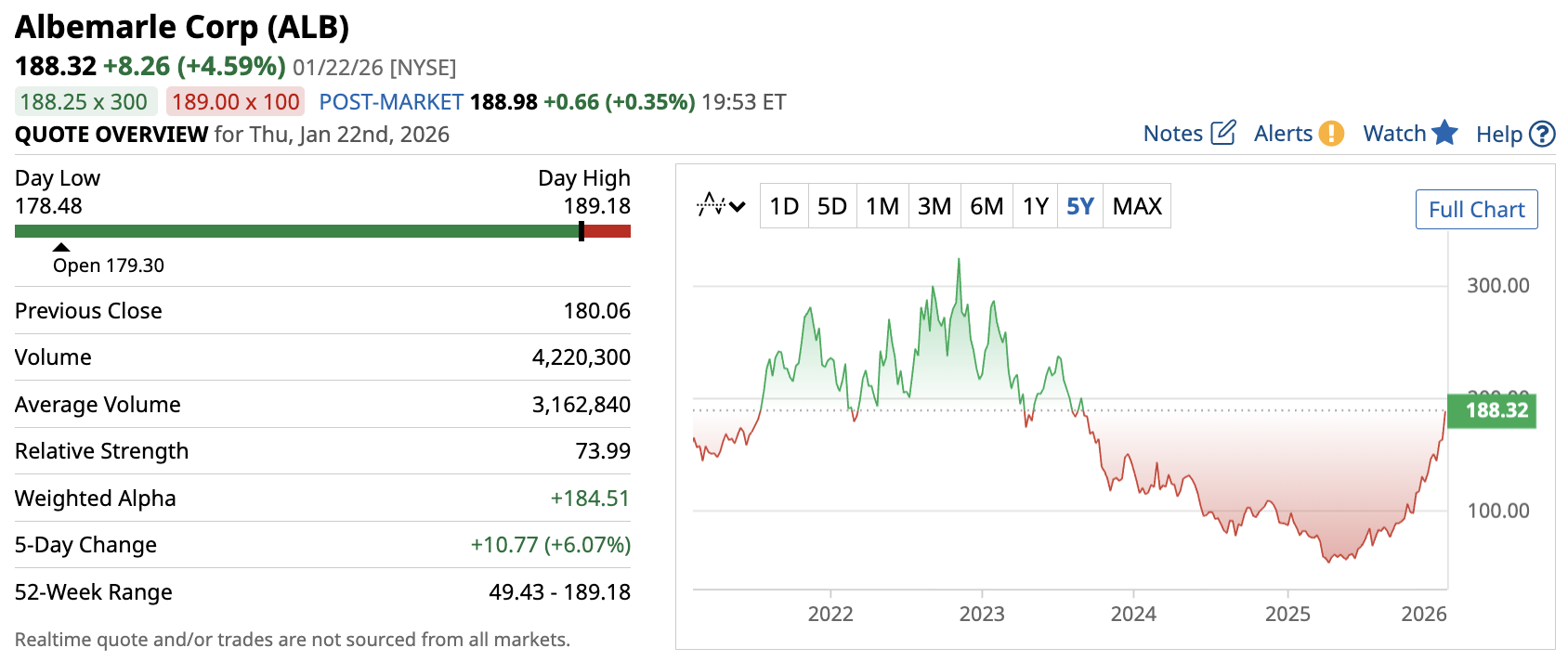 In its recent quarterly financials, sales were reported down 4% YOY to $1.3 billion, while its net loss improved 85% to almost $161 million. Regardless, Albemarle pays a forward annual dividend of $1.62, translating to a yield of around 0.9%.