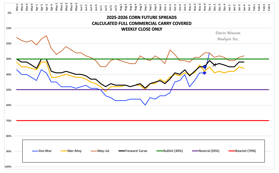 - The initial 2025-26 December-March futures spread covered as much as 60% calculated full commercial carry during the heart of the 2025 harvest, not quite reaching the bearish level of 70%. Further out, the May-July futures spread has covered a bullish level of calculated full commercial carry since mid-July.