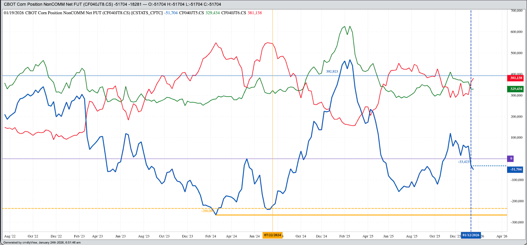 The question asked more than any other: Were USDA’s numbers right? My answer: It doesn’t matter. It has never mattered, but now less so than ever. All that matters is the numbers generate a response from trade algorithms, and to that we can say, “Mission accomplished”. There’s a reason these reports are released during business hours: Trade volume. Last Monday (January 12), the CME reported trade volume in the corn futures market alone of 1,059,630 contracts. This was the largest daily volume number since March 29, 2019, also a USDA report day (quarterly Grain Stocks). When the latest CFTC Commitments of Traders report (legacy, futures only) was released, for the week ending Tuesday, January 13, the day after WASDE, noncommercial traders held a net-short futures position of 33,423 contracts, a switch of 93,535 contracts from the previous week. This switch, amounting to roughly 468 mb, included a decrease in long futures of 35,327 contracts and an increase in short futures of 58,208 contracts.