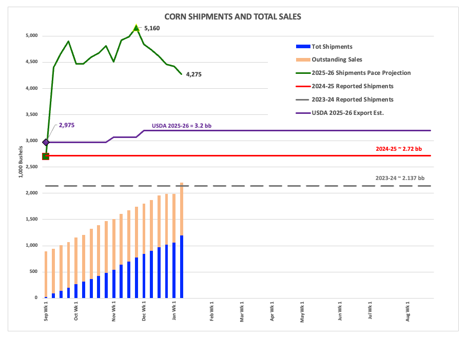 The bottom line from our reads on real fundamentals is this: The US produced a big crop, how big is irrelevant. However, since the National Corn Index, national average basis, and futures spreads did not collapse we have known that regardless of how big the crop was, demand has held available supplies in check since last harvest. And given feed demand remains light due to a smaller US cattle herd, and ethanol demand remains under pressure from the petroleum friendly US administration, the spotlight is on exports. Through the end of November (Q1), total US shipments projected marketing year export demand of 5.16 bb, an increase of 90% from 2024-25’s reported shipments of 2.72 bb. By the end of December, the pace projection had slipped to 4.85 bb, still up 78% from last year.