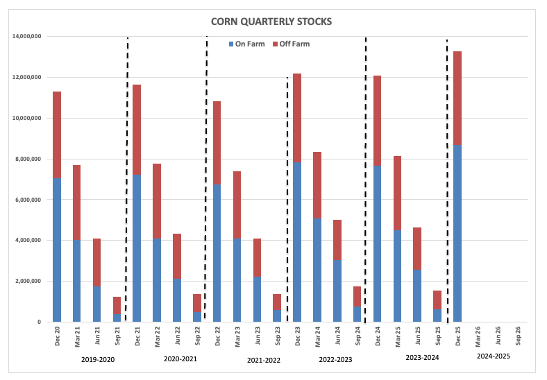 When USDA released its January WASDE report, US corn production jumped from the previous 425.53 mmt (16.75 billion bushels) to a record 432.34 mmt (17.02 bb), an increase of 1.6%. Carrying the numbers out to the ledger's end, US ending stocks were increased to 56.56 mmt (2.23 bb), theoretically putting ending stocks-to-use at 13.6%, what would be the largest ending stocks-to-use figure – again theoretically – since the end of the 2008-09 marketing year at a reported 13.9%. Not only that, but quarterly stocks as of December 1 were pegged at 13.28 bb, also the largest December 1 figure on record.