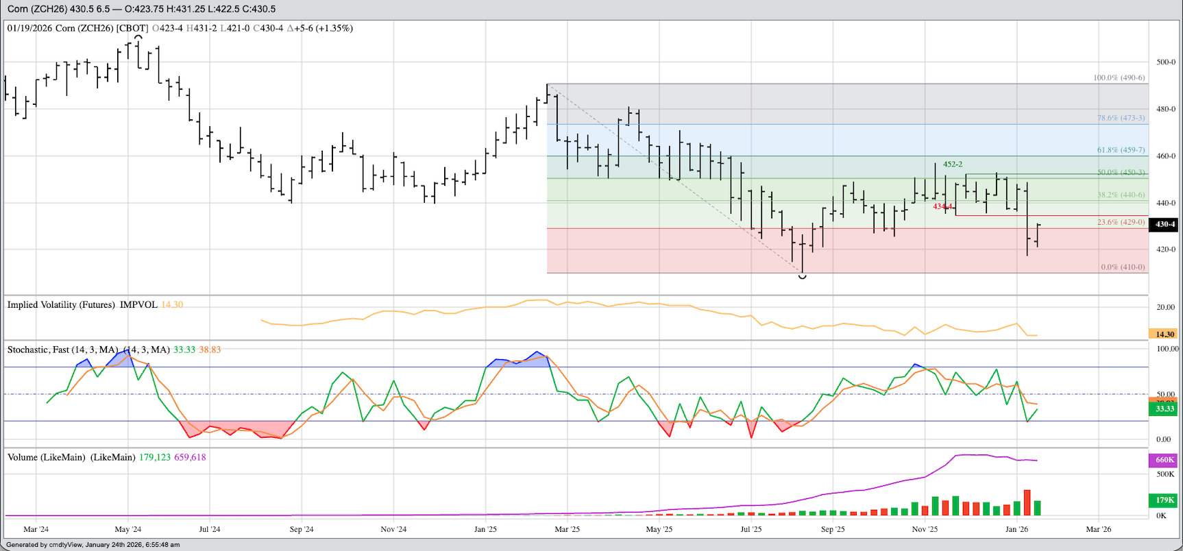 Nevertheless, the corn market saw its price levels reset due to USDA’s questionable numbers. On its intermediate-term weekly chart, the nearby March futures contract (ZCH26) broke out of its sideways range between roughly $4.30 and $4.60 as it fell to a low of $4.1725 on noncommercial selling. The new-crop December issue (ZCZ26) fell back to $4.4525, opening the door to a possible test of $4.40 over the coming weeks with its key major low at $4.3875 from the last week of August.