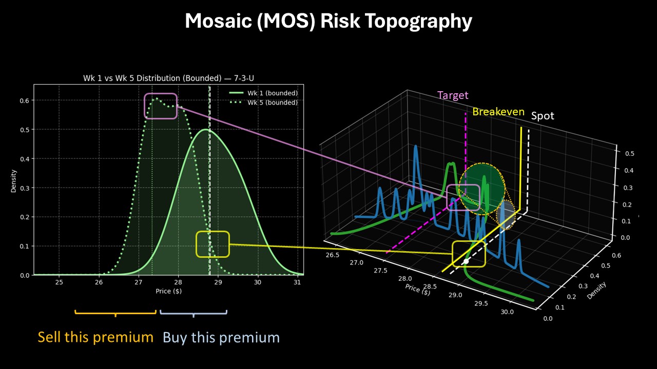 In this case, I believe this perception aligns with reality. Over the last 10 weeks, MOS stock had printed seven up weeks, leading to an overall upward slope. Under this 7-3-U sequence, the forward 10 weeks would be expected to range between $24 and $31 (assuming a spot price of $28.79, Friday’s close).