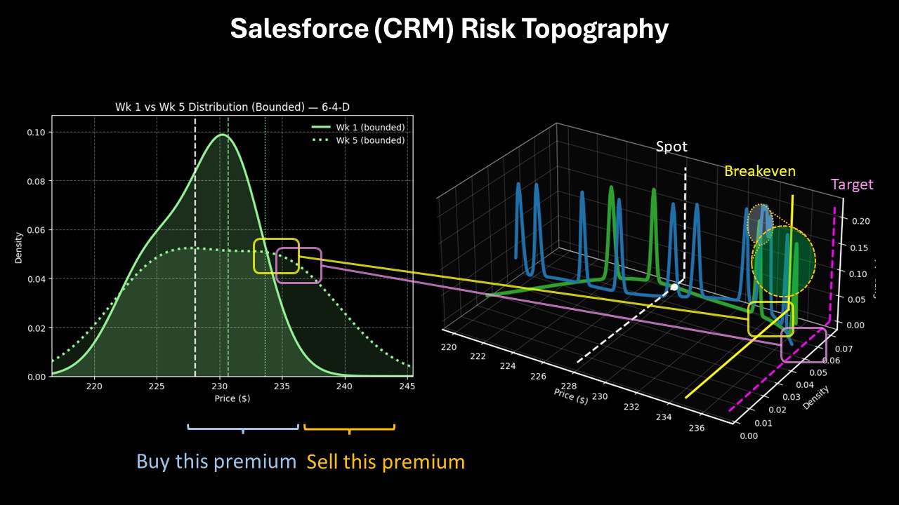 Nevertheless, context may be everything. In the last 10 weeks, CRM stock printed six up weeks but with an overall downward slope. Under this rare 6-4-D sequence, CRM would be expected to range between $210 and $250 over the next 10 weeks, with probability density peaking around $235 (assuming a spot price of $228.05). Over the next five weeks, probability density would likely peak between $223 and $237.