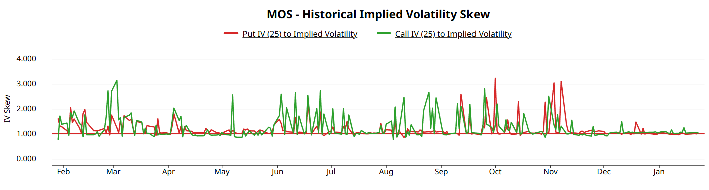 Over the next five weeks, forward outcomes would likely congregate between $26 and $29.50, with probability density peaking around $27. Given how the probabilities are stacking up, traders may find temporary success going with the 30/27.50 bear put spread expiring Feb. 20. Should MOS stock fall through the $27.50 strike, the maximum payout would be nearly 84%.