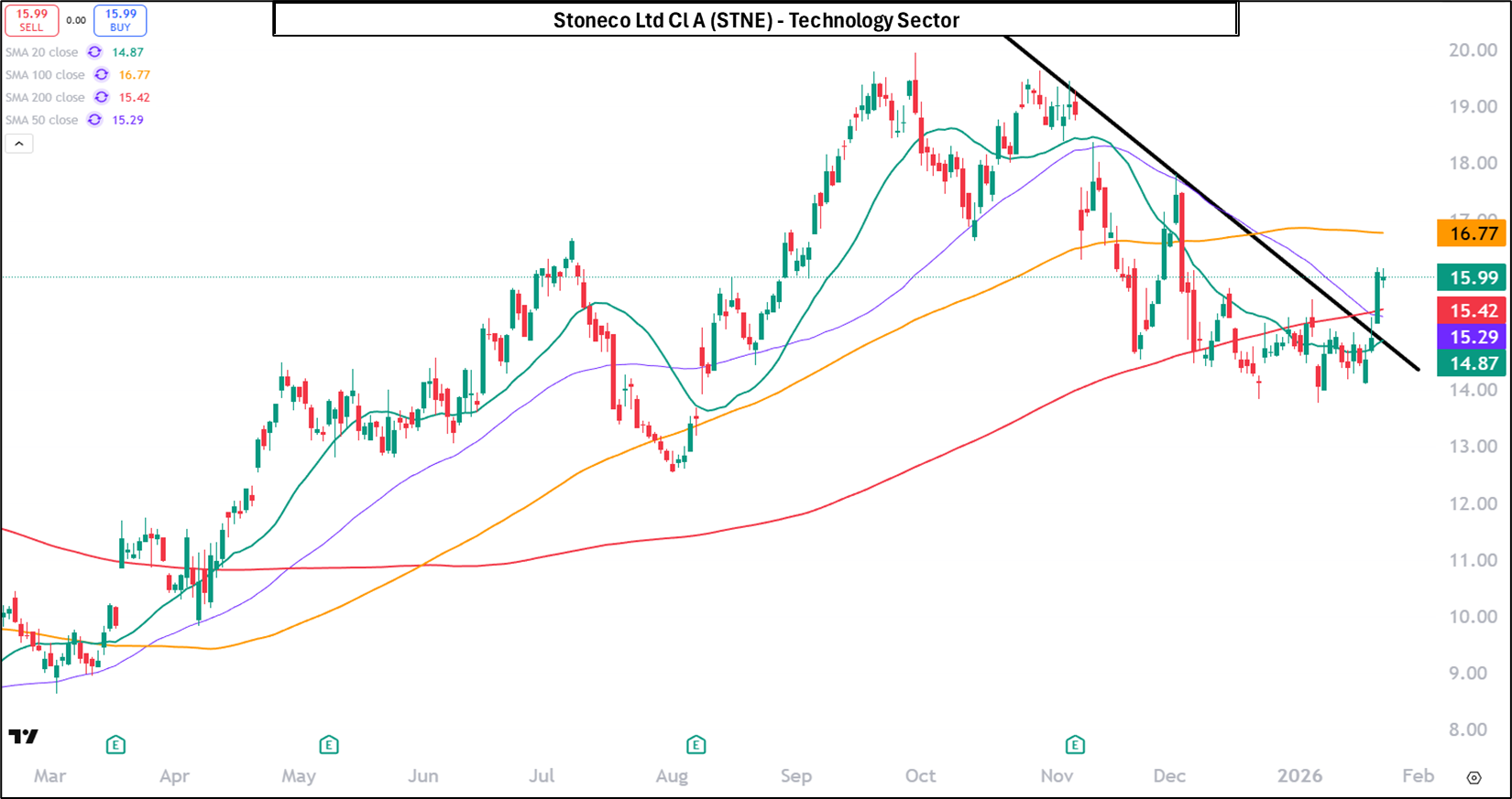 StoneCo Ltd (STNE) has recently broken above a well-defined short-term downtrend, signaling a potential shift in momentum after several weeks of consolidation. The stock reclaimed its 20- and 50-day moving averages and pushed back toward the mid-$16 area, while the rising 200-day moving average remains longer-term support. This move suggests improving near-term sentiment.