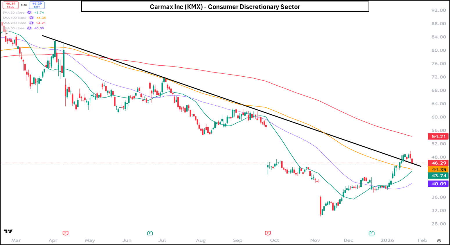 CarMax Inc (KMX) has staged a sharp rebound from its November lows, rallying strongly through December and early January as momentum carried the stock back above its short- and intermediate-term moving averages. That advance recently stalled near the declining long-term downtrend line and the 100-day moving average, where sellers stepped back in. The latest pullback suggests near-term consolidation or digestion of gains, with price now testing whether former breakout levels can hold as support.