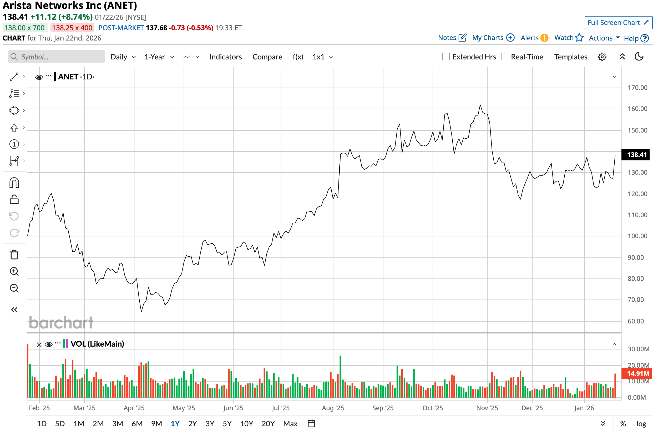 Valued at a market cap of $160.3 billion, the ANET stock is up 5% over the past year.