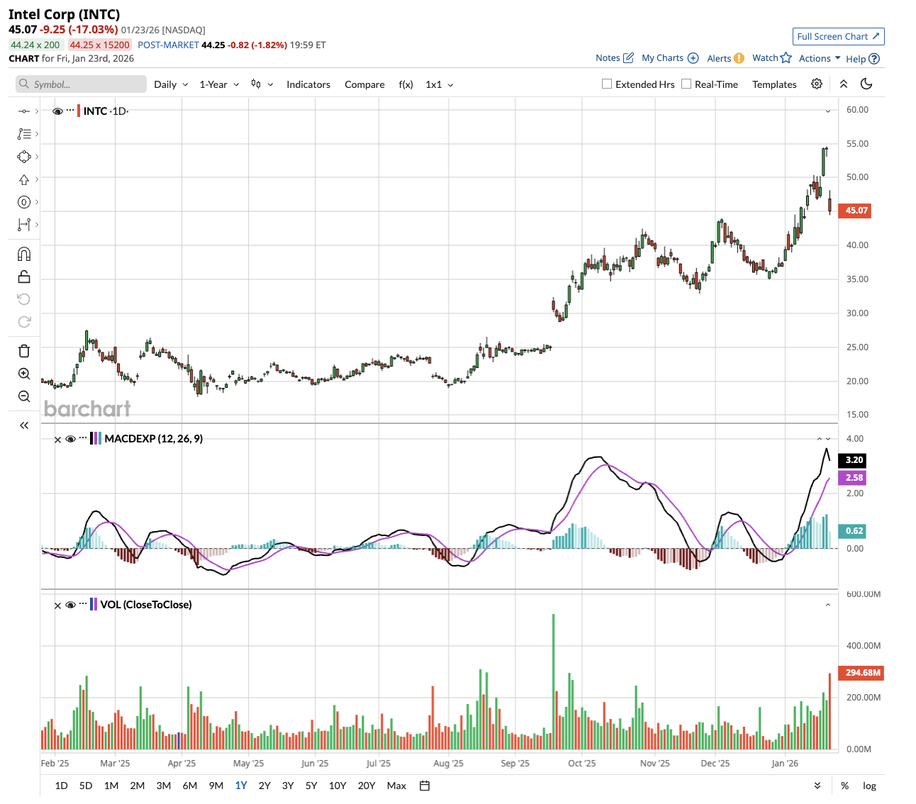 Intel (INTC) stock crashed more than 17% on Friday after the chipmaker delivered fourth-quarter earnings that beat Wall Street estimates but issued disappointing guidance for the current quarter. The selloff marked the worst single-day decline for Intel since August 2024.