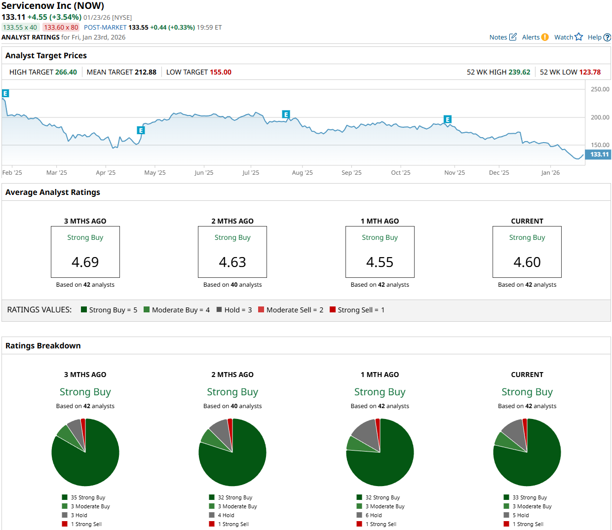 Many Wall Street analysts disagree with investor concerns about AI disrupting ServiceNow’s business. Of the 42 analysts covering the stock, 33 recommend a “Strong Buy,” three suggest a “Moderate Buy,” five advise holding, and one assigns a “Strong Sell” rating. This translates to a top-tier “Strong Buy” consensus rating. The average price target for NOW stock is $212.88, indicating a 59.9% upside potential from Friday’s closing price.