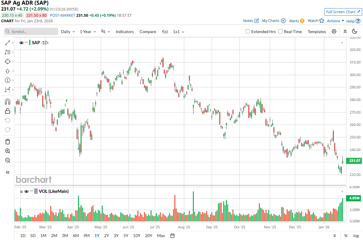 Meanwhile, Jefferies recently reiterated its “Buy” rating on SAP and maintained a 290 euro ($345) price target. Jefferies analyst Charles Brennan said that although SAP is trading about 15% above prior trough valuations, the stock still appears to be nearing a valuation trough for a company growing recurring revenue at roughly 15%. Software sentiment “has rarely been lower, with AI casting a shadow of uncertainty for the sector,” Brennan said in a note. Jefferies believes that SAP is a “higher-quality business now than at any time in the past.”