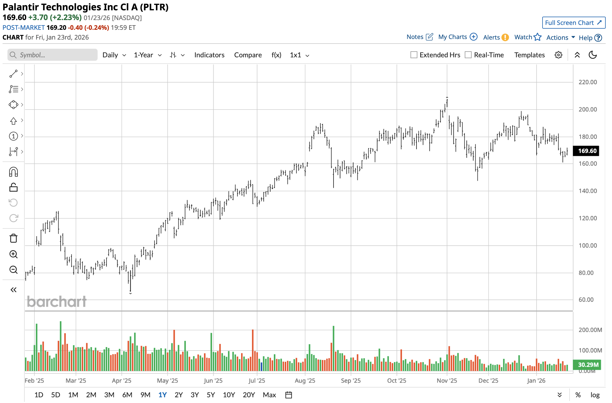 For the past 52 weeks, PLTR has been very volatile, trading between a low of $66.12 per share and a high of $207.52 per share. Though it has pulled back somewhat, it remains substantially higher over the past year, evident by a weighted alpha of +73.7. This far surpasses the rest of the market, even though it has pulled back somewhat since late 2025.