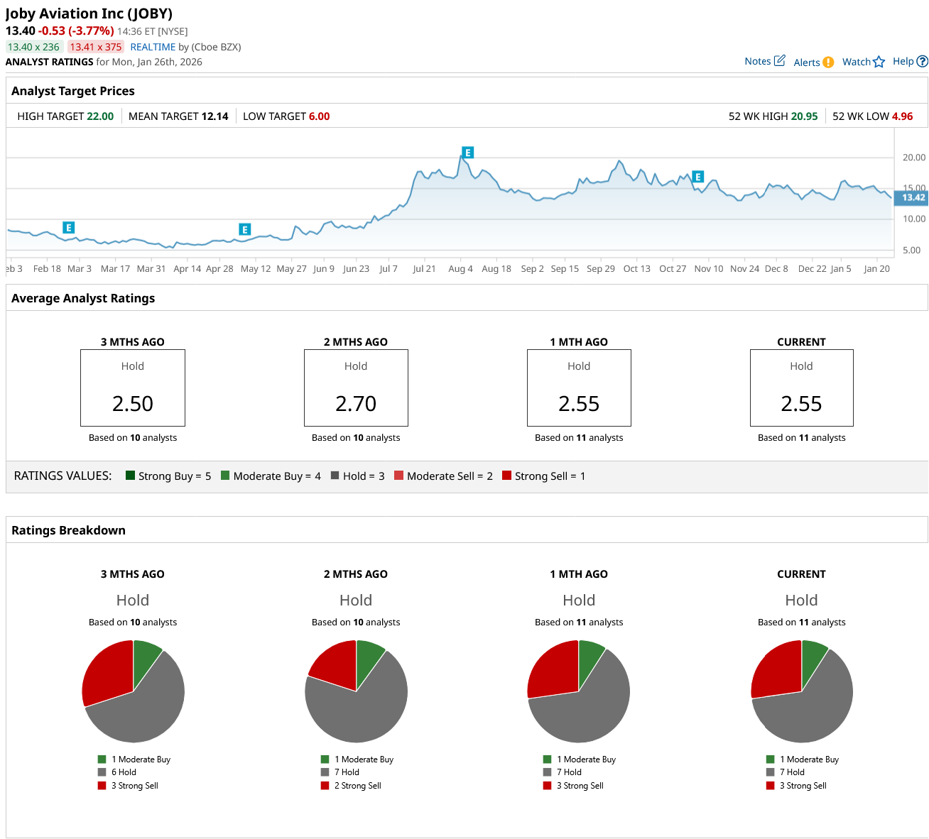 JOBY stock has received one “Moderate Buy” rating, seven “Hold” ratings, and three “Strong Sell” ratings from analyst reviews so far.