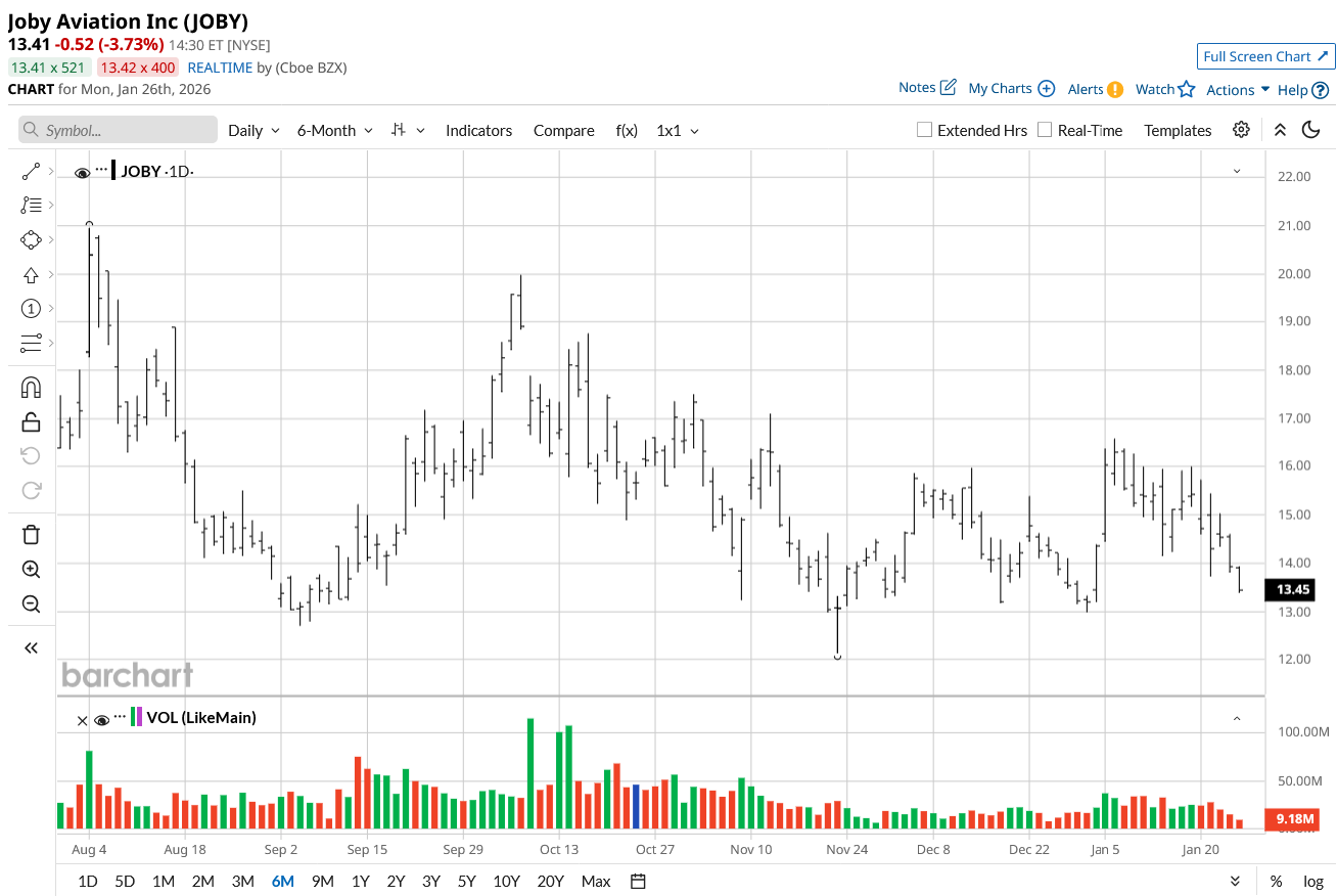 Joby Aviation’s stock has slipped about 4% today while being 36% off its 52-week high of $20.95 set in April 2025, but up 172% from its 52-week lows of roughly $5 set in early July last year. JOBY stock has slipped close to 13% in the last five days and 25% in six months but is up 54% in the past 52 weeks.