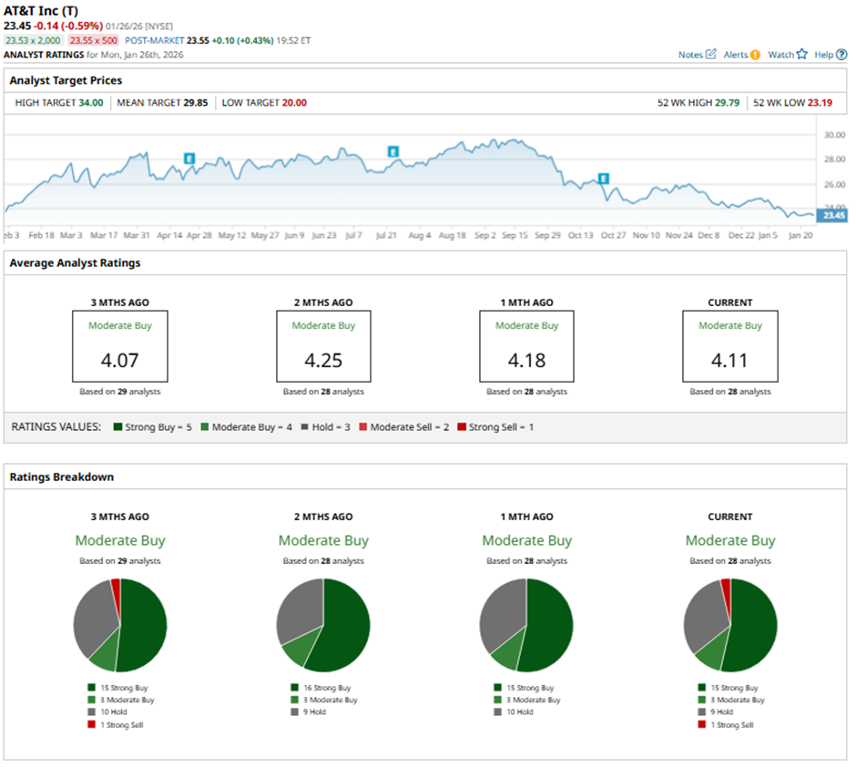 The mean price target of $29.85, representing a premium of 27.3% to AT&T's current price. The Street-high price target of $34 suggests a nearly 45% potential upside.