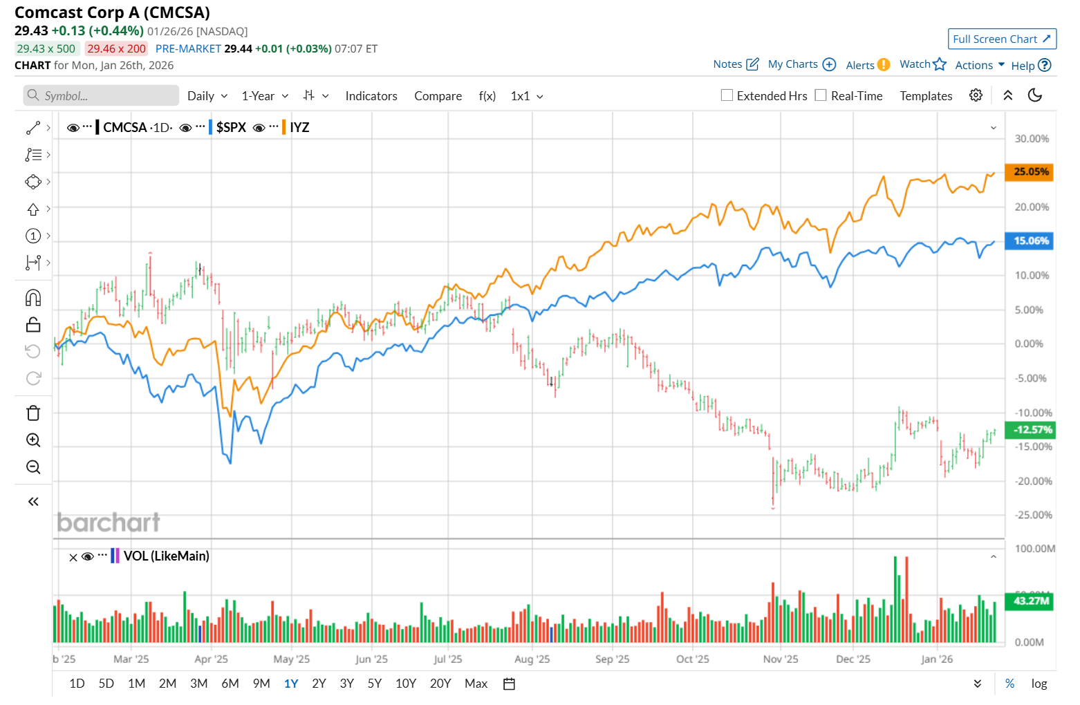 This media company has significantly lagged behind the broader market over the past 52 weeks. Shares of CMCSA have declined 21.8% over this time frame, while the broader S&P 500 Index ($SPX) has gained 13.9%. Moreover, on a YTD basis, the stock is down 1.5%, compared to SPX’s 1.5% uptick.