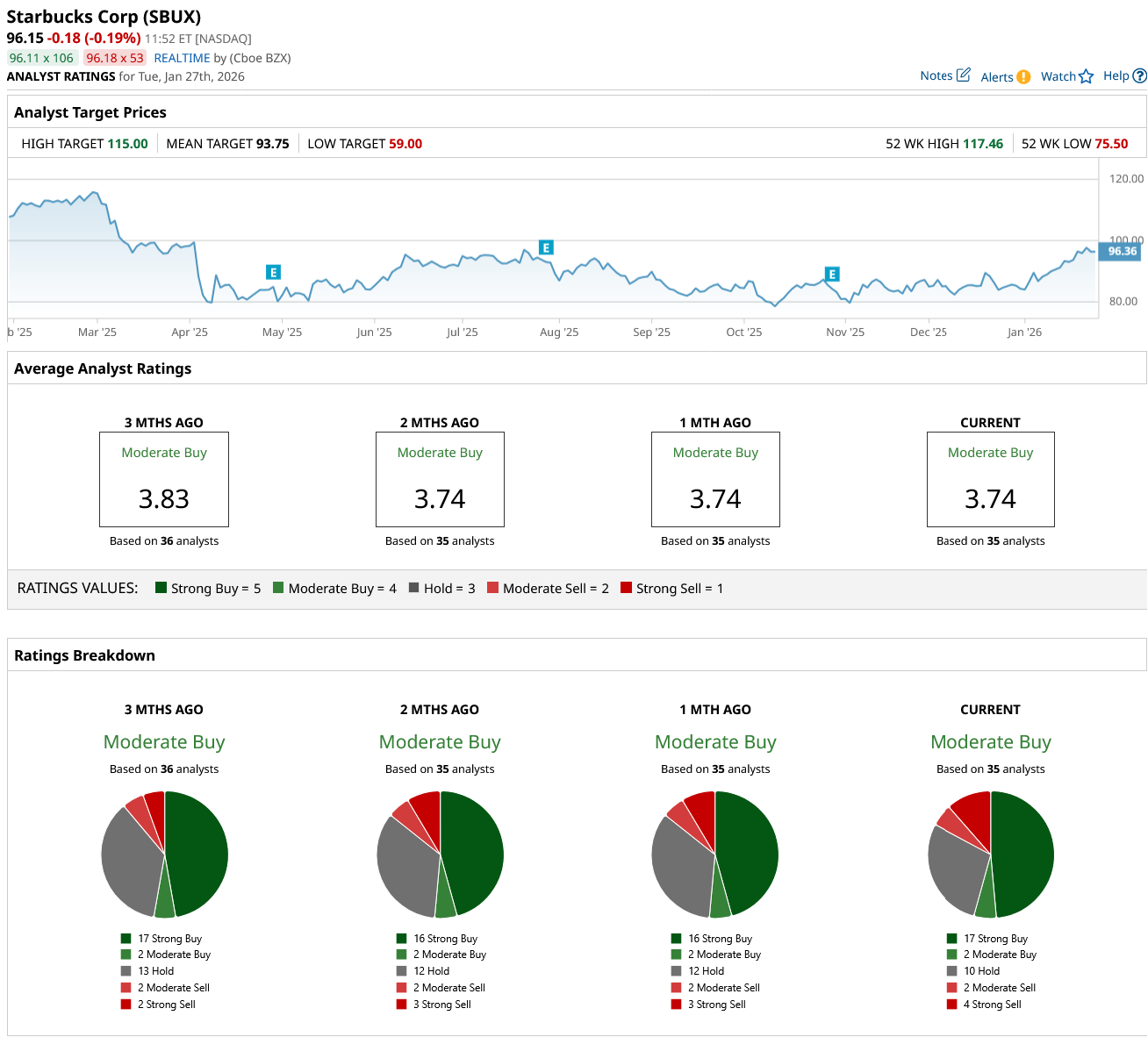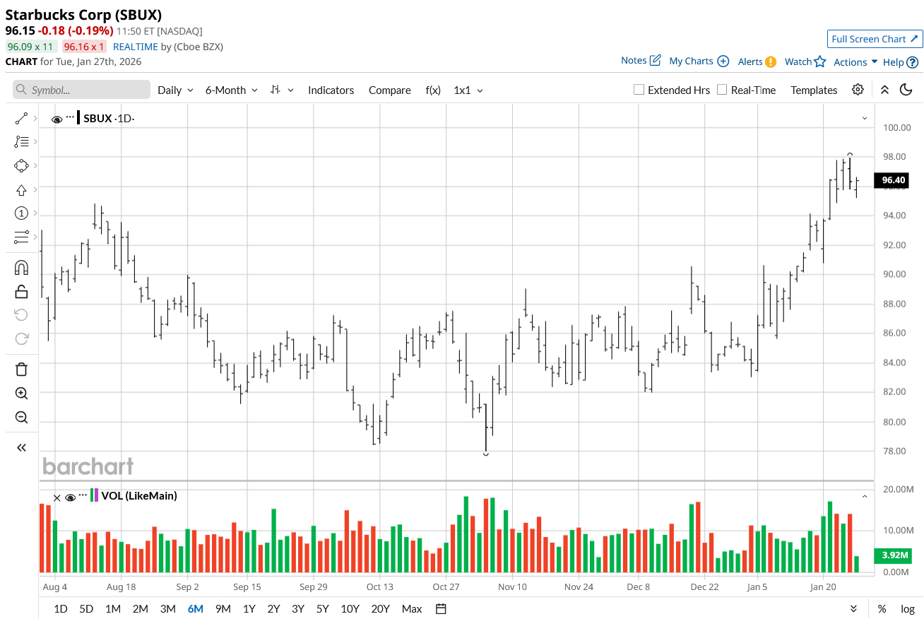Starbucks' stock has shown strong momentum in early 2026. As of late January, SBUX shares are up 14.5%, with a 3% gain in the last five days and 13% in a month. Despite this, Starbucks struggles from a medium- and long-term viewpoint, with shares gaining just over 2% in six months while being 18% off its 52-week high reached in March last year.