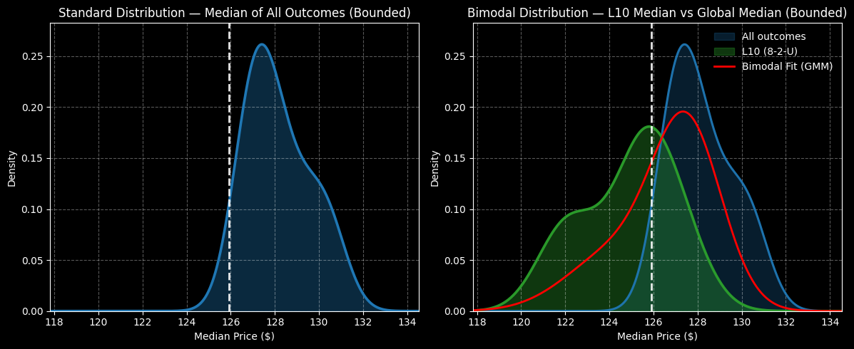 What is the current context of NEM stock? It’s arriving to us having printed eight up weeks in the last 10 weeks, leading to an overall upward slope. Under this 8-2-U sequence, we would expect NEM to range between $118 and $132, with probability density peaking around the current spot price.