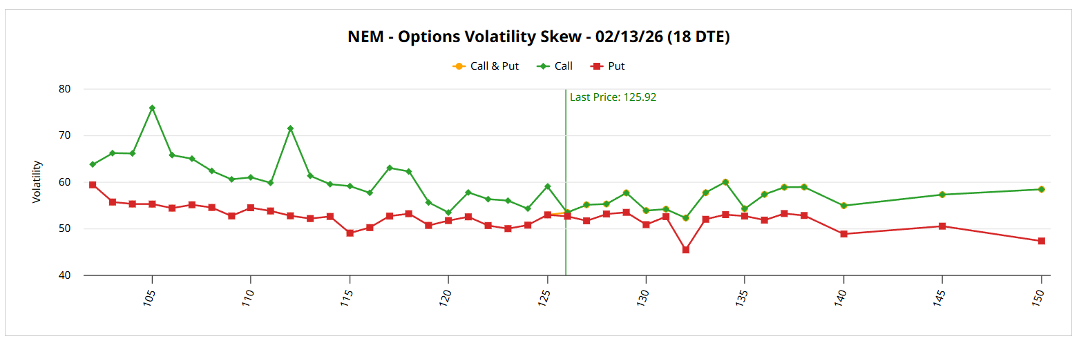 It’s risky but I’m liking the idea of the 125/122 bear put spread expiring Feb. 6, 2026. If NEM stock falls through the $122 strike at expiration — which is not an inconceivable outcome — the maximum payout would be over 101%. A breakeven price of $123.51 adds a touch more probabilistic credibility to the trade.