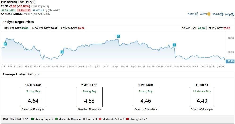 The consensus rating on Pinterest remains a “Moderate Buy,” with price targets as high as $45 indicating the social media company could nearly double from here over the next 12 months.