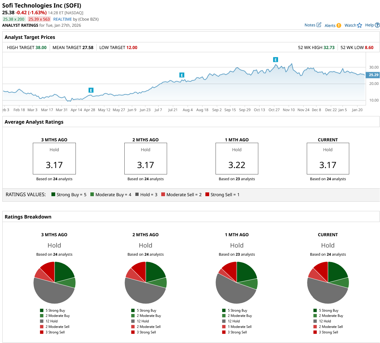 Consensus among analysts leans toward a "Hold" rating for SOFI stock, based on coverage from 24 firms as per Barchart data. The breakdown includes five "Strong Buy," two "Moderate Buy," 12 "Hold," two "Moderate Sell," and three "Strong Sell" ratings, reflecting a cautiously optimistic view amid growth prospects but valuation concerns.Â