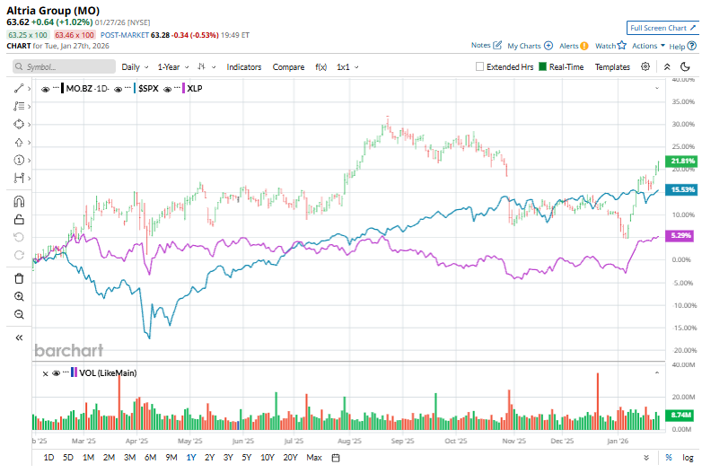 Shares of this leading tobacco company have outperformed the broader market over the past year. MO has gained 19% over this time frame, while the broader S&P 500 Index ($SPX) has rallied nearly 16.1%. However, over the past six months, MO stock has soared 6.3%, trailing the SPX’s 9.2% gains on a