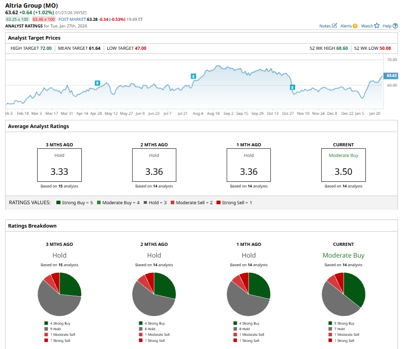 Among the 14 analysts covering MO stock, the consensus is a “Moderate Buy.” That’s based on five “Strong Buy” ratings, seven “Holds,” one “Moderate Sell,” and one “Strong Sell.”