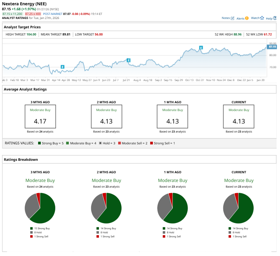 Among the 23 analysts covering NEE stock, the consensus is a “Moderate Buy.” That’s based on 14 “Strong Buy” ratings, eight “Holds,” and one “Strong Sell.”