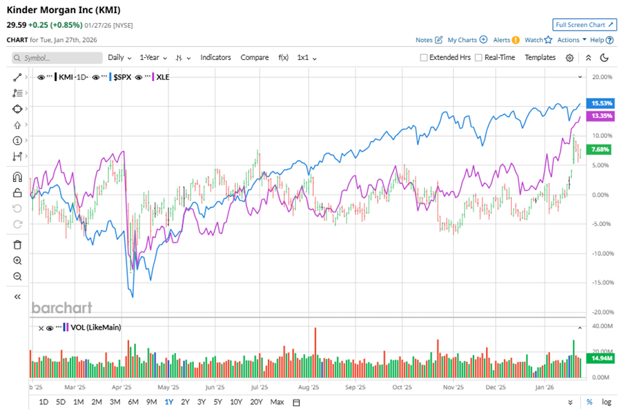 Shares of this midstream giant have underperformed the broader market over the past year. KMI has gained 7.8% over this time frame, while the broader S&P 500 Index ($SPX) has rallied nearly 16.1%. However, in 2026, KMI stock is up 7.6%, surpassing the SPX’s 1.9% rise on a YTD basis.