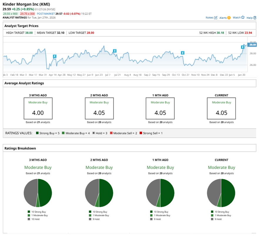Among the 20 analysts covering KMI stock, the consensus is a “Moderate Buy.” That’s based on 10 “Strong Buy” ratings, one “Moderate Buy,” and nine “Holds.”