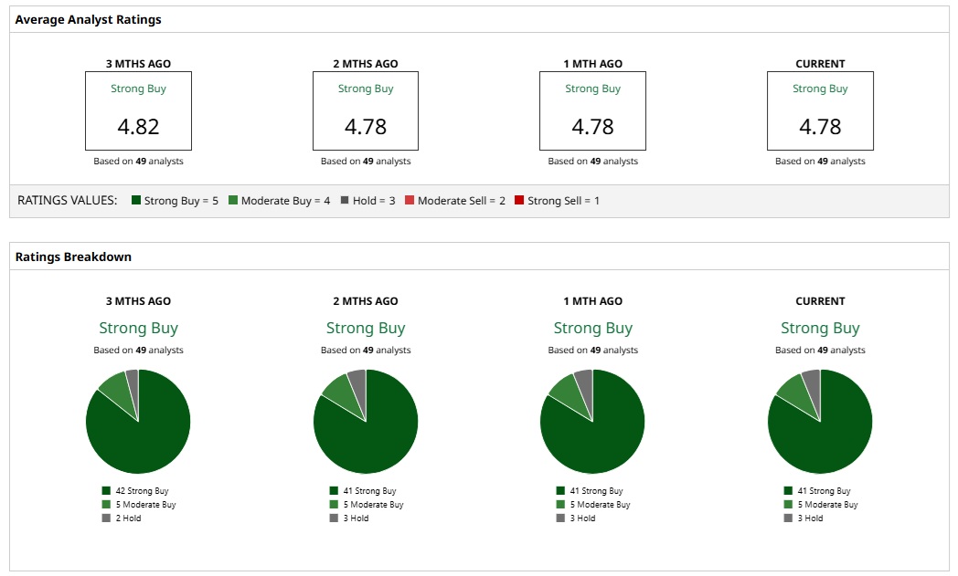 Given the ratings of 49 analysts, MSFT stock is a consensus “Strong Buy.” An overwhelming majority of 41 analysts assign a “Strong Buy” rating to MSFT. Further, three analysts and two analysts have “Moderate Buy” and “Hold” ratings, respectively.