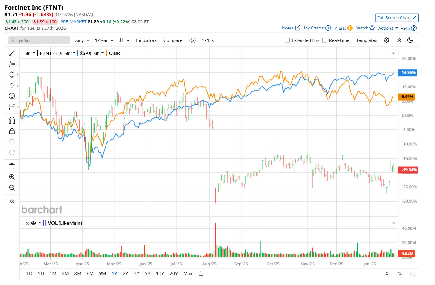 Narrowing the focus, FTNT has also lagged behind the First Trust NASDAQ Cybersecurity ETF (CIBR), which rose 10.2% over the past 52 weeks. Nonetheless, it has outpaced CIBR’s marginal YTD rise.