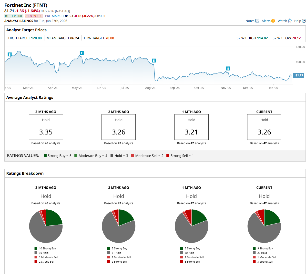 On Jan. 23, The Toronto-Dominion Bank (TD) analyst Shaul Eyal upgraded FTNT to "Buy," with a price target of $100, indicating a 22.4% potential upside from the current levels.