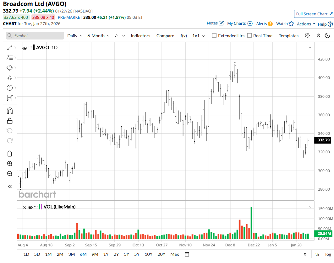 After a poor start to the year, AVGO is down about 3% year-to-date (YTD); the company’s stock is finally picking up pace. The Maia 200 developments are likely going to help it catch up to the iShares Semiconductor ETF (SOXX), which has already gained 18% so far this month.